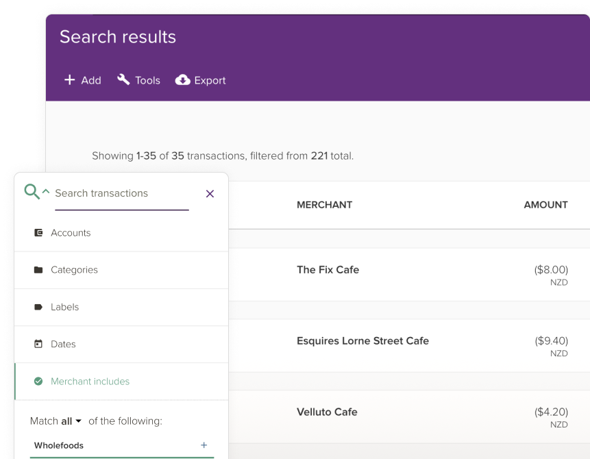 Categorize, label and annotate your spending, your way. Then use our amazing search engine to find transactions.
