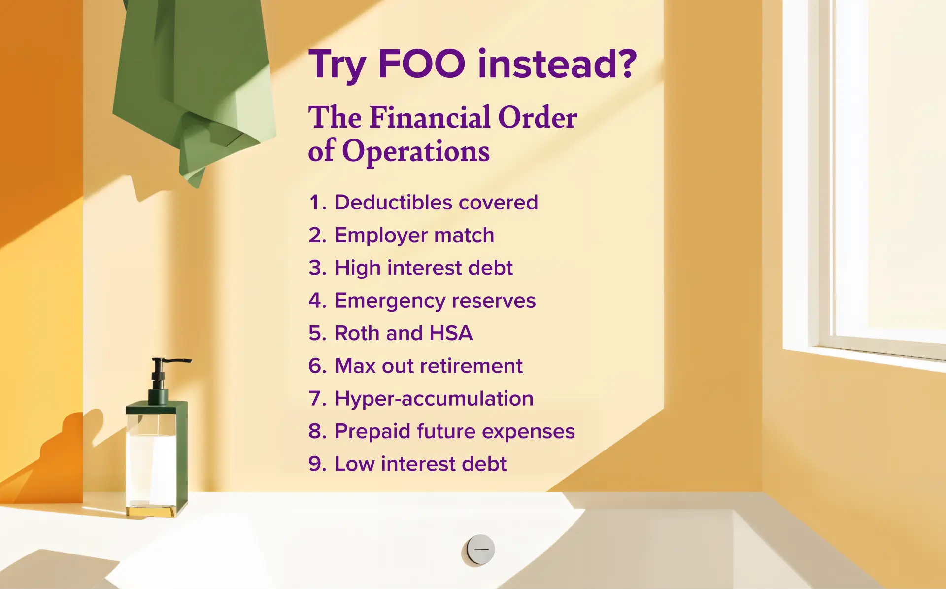 Many who were turned off by the Baby Steps prefer the Financial Order of Operations (FOO) method by Brian Preston, aka The Money Guy.