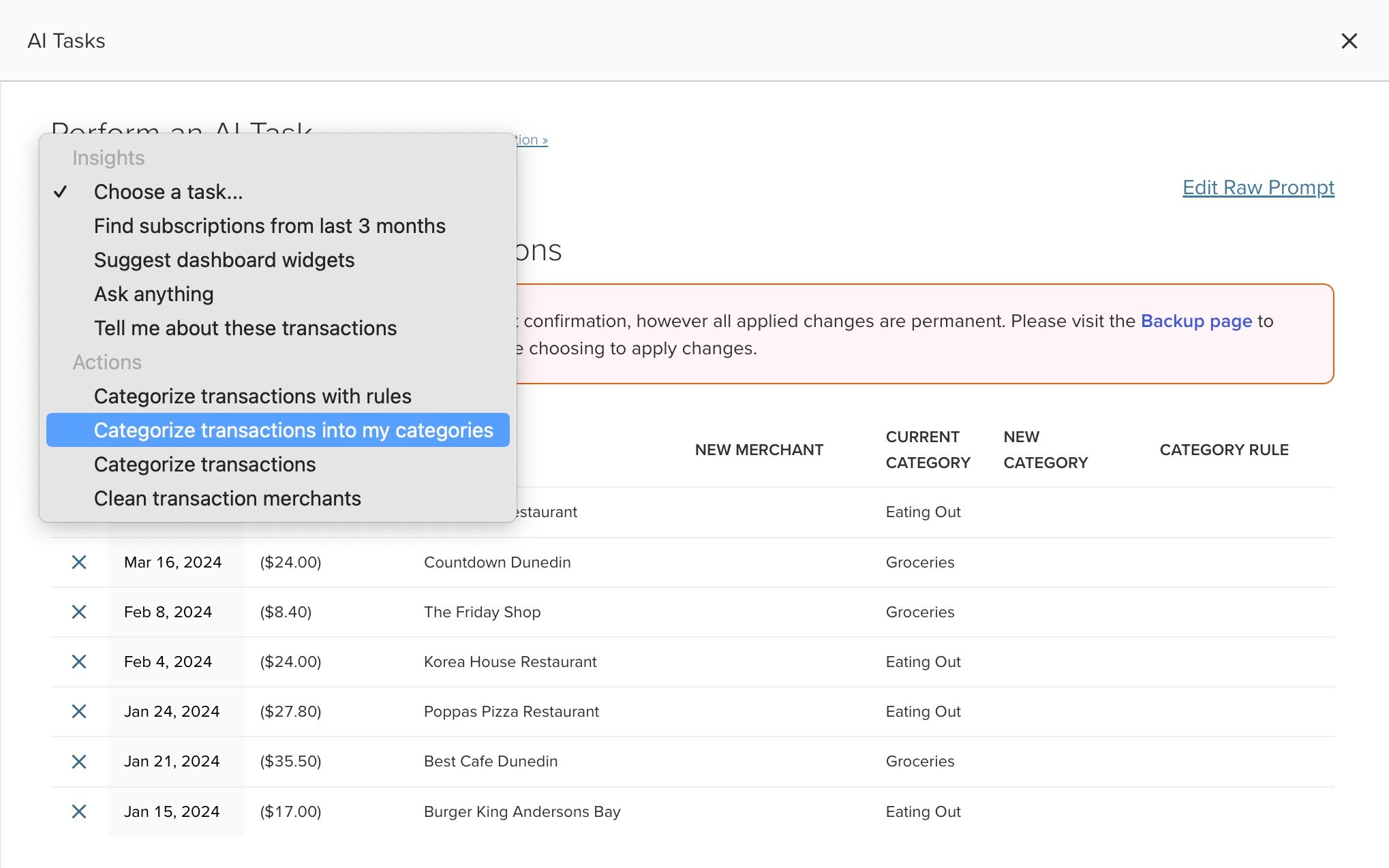 AI Tasks is now available for users that have enabled beta testing. Just click ‘🤖 AI Tasks’ in the Transactions page toolbar.
