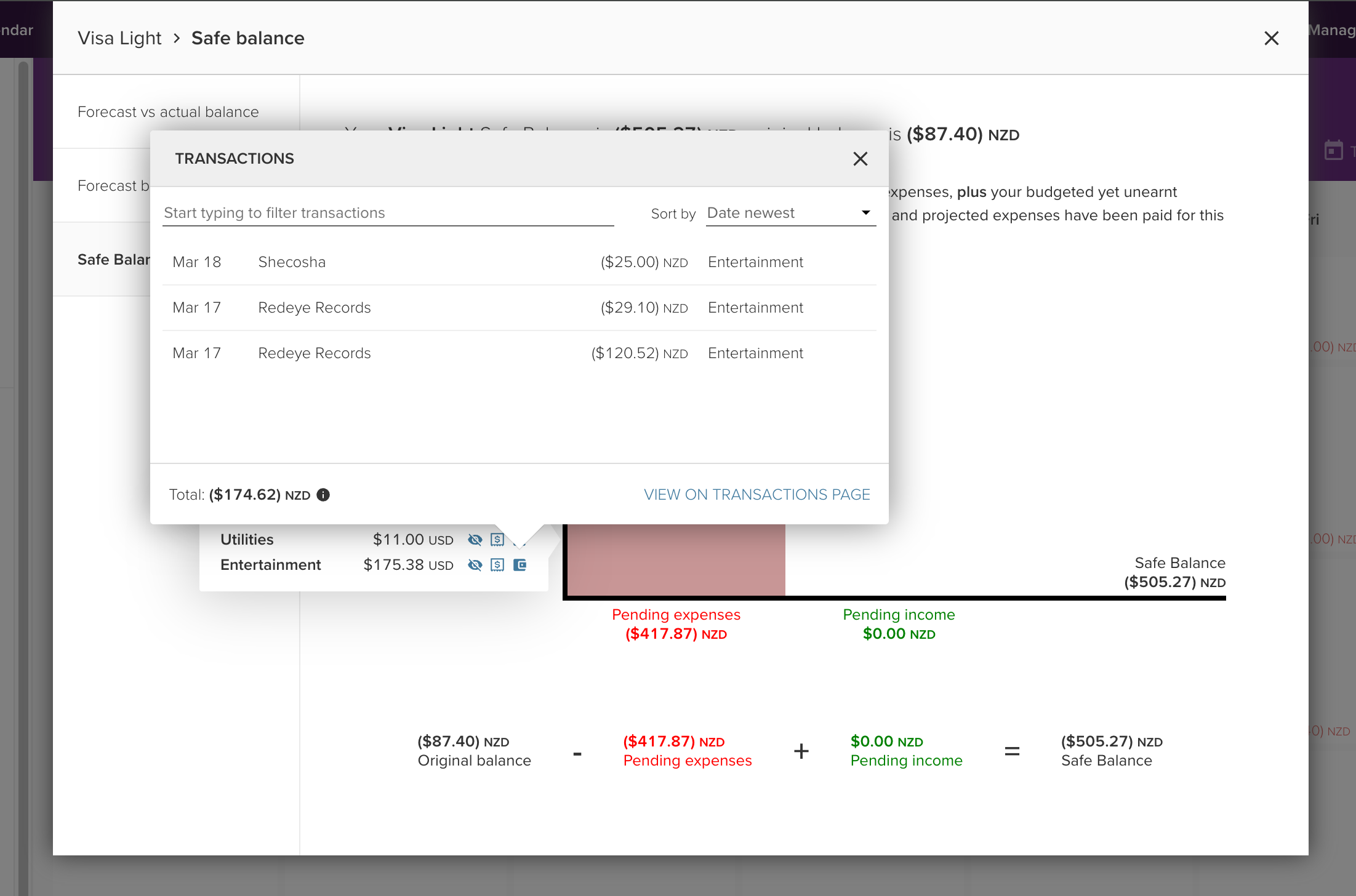 New buttons have been added to the safe balance popups, which when clicked show the budgets and transactions within that budget period, leading to the safe balance shown.