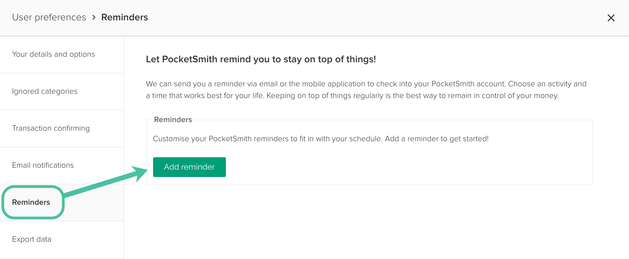 Whatever the reason, PocketSmith can help nudge you in the right direction with the Reminders feature. This is what’s known as an environmental support. Environmental supports can go a long way towards helping you keep your money habits on track.