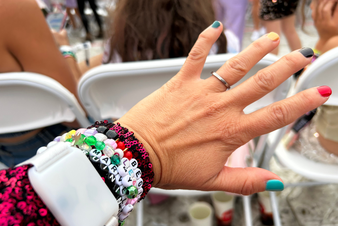 The famed Taylor Swift friendships bracelets in action.