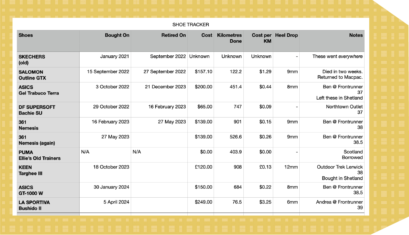 The tracker spreadsheet is simple. It started as part of Wilderness Magazine’s Walk1200KM challenge. I check my iPhone’s fitness tracker, plug in my daily kilometers walked, and then keep a running tally for whatever shoes I was wearing at the time. I’ve been tracking it for a few years now. That’s long enough to know what my average spend on a pair of shoes is, how long they should last me, and to warn me when I need to replace them.