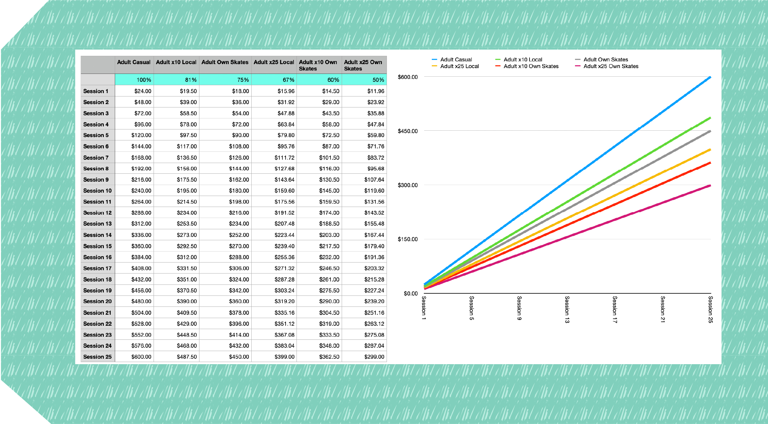 Buying the skates costs me $15 up front and it saves me a full 50% on every entry ticket. That’s a whopping $300 over 25 entries (or $285 factoring in the cost of the skates.)