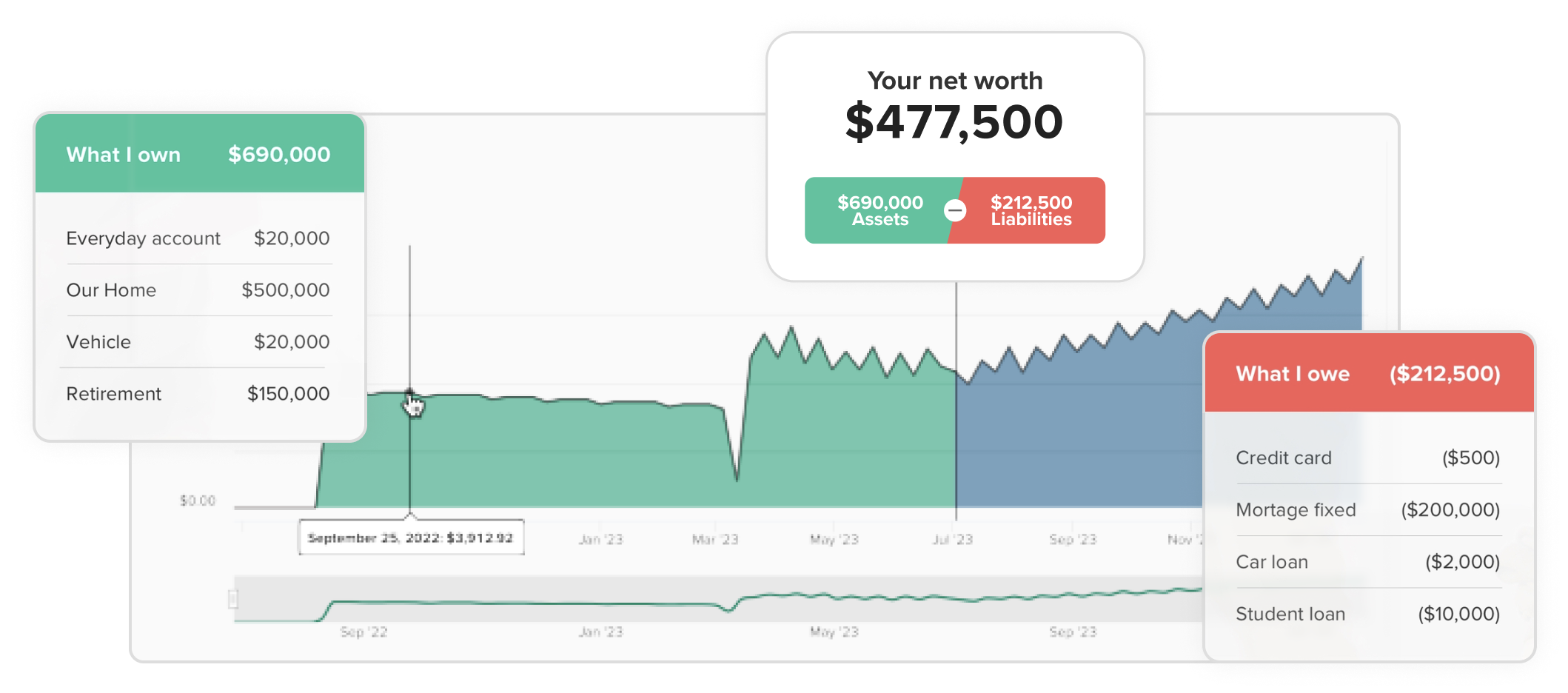 Our personal net worth app allows you to measure your total financial performance across all accounts, assets and liabilities.