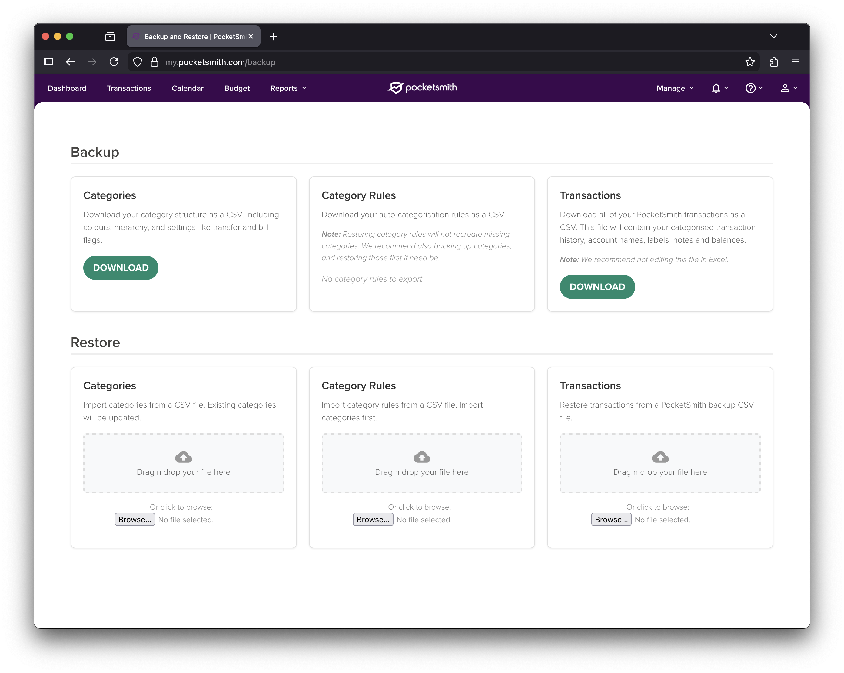 Just head to Manage > Backup and Restore from the main PocketSmith menu to see the new options.