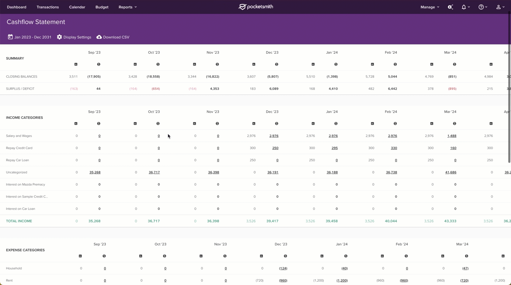 The Cashflows report now has fixed headers for months and category names, allowing you to scroll down or across the page and still easily know what the numbers are referring to.