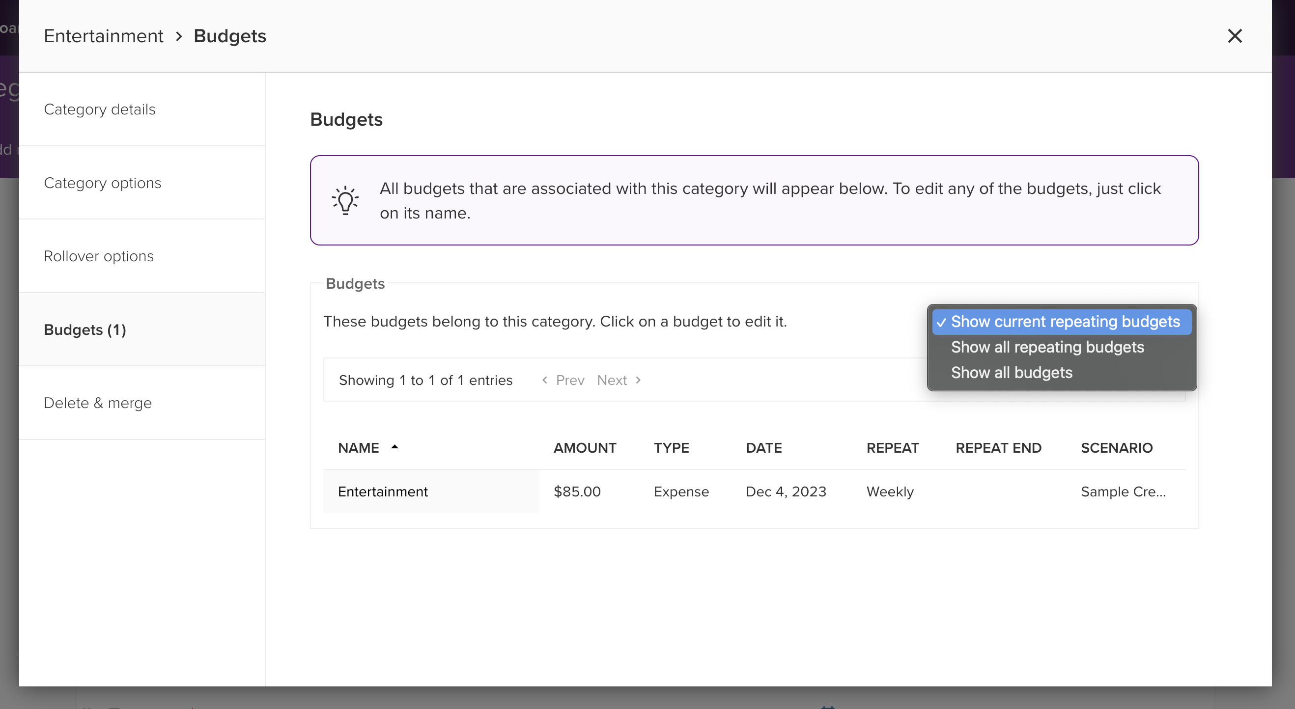 A new dropdown now appears to the top right of the category budgets modal, which lists all budgets within a particular category. This allows you to filter the budgets shown within to current repeating budgets (the default), all repeating budgets and all budgets (including one-off events).