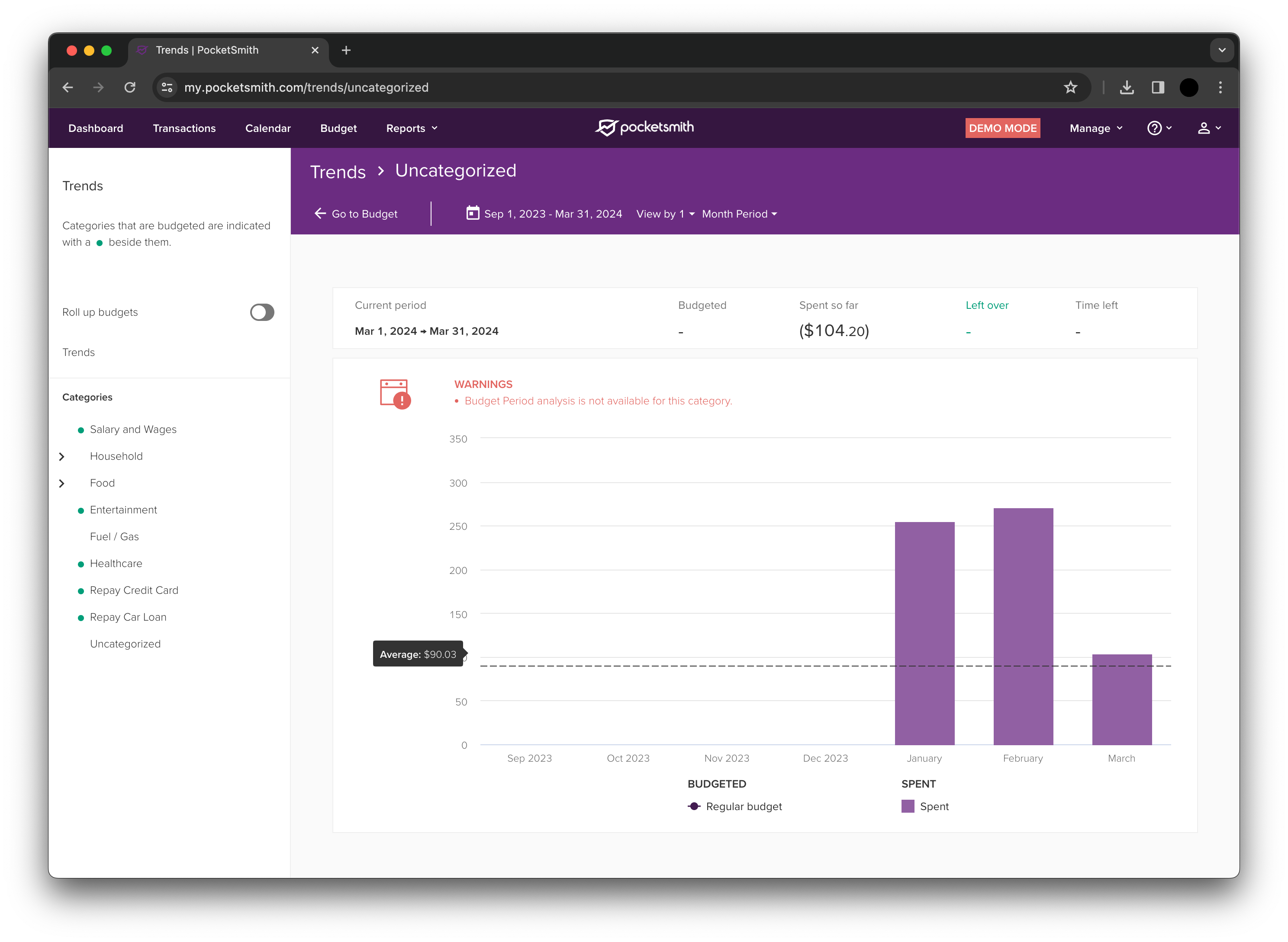 Clicking this “Uncategorized” will take you through to a trends summary for your uncategorized transactions, which works the same as any other unbudgeted category.